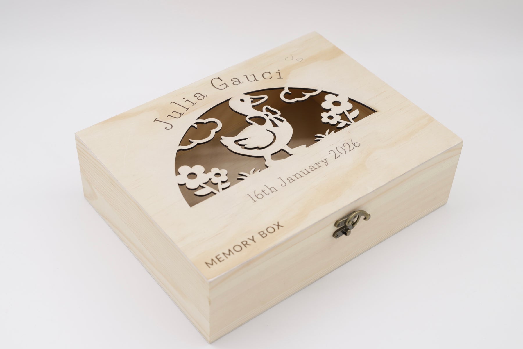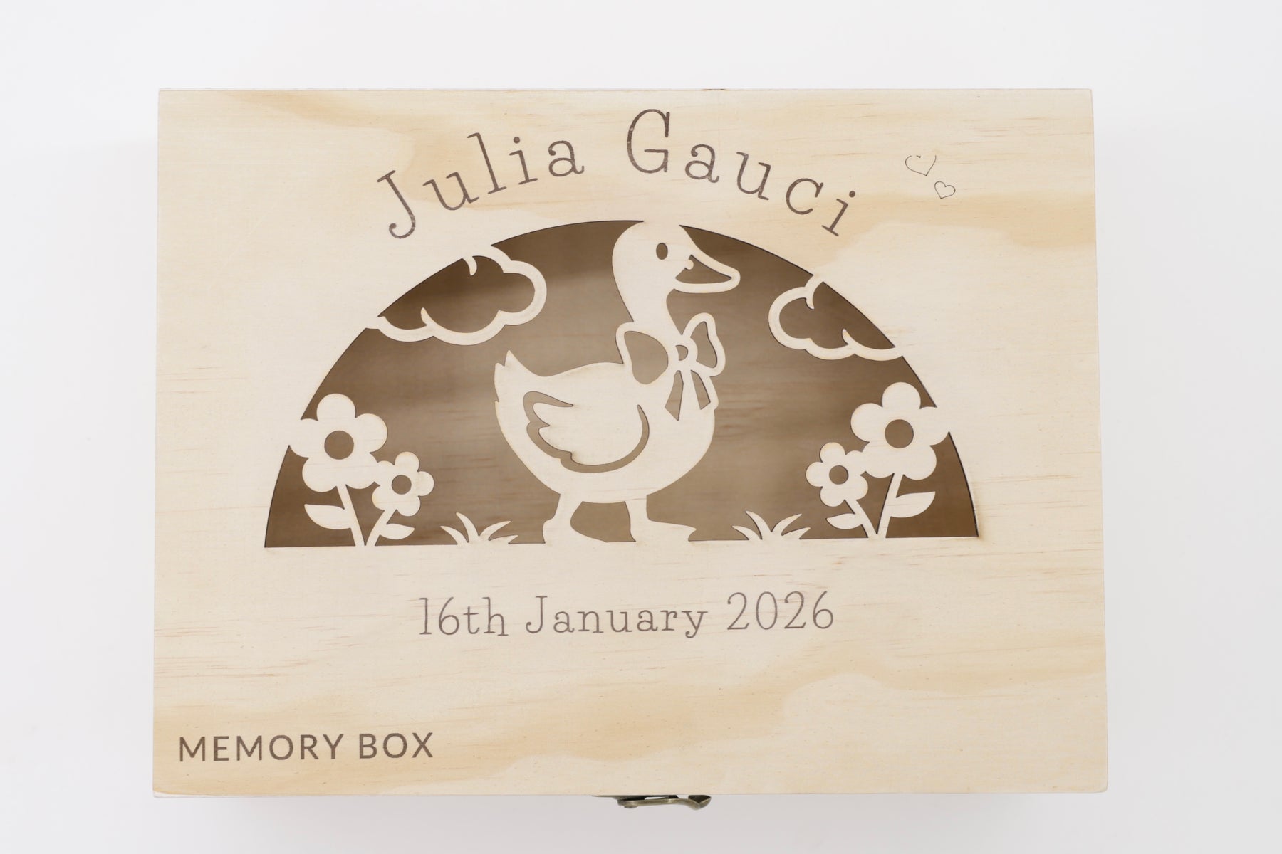 • Natural wooden memory box with laser-cut gosling and floral design on the lid.
